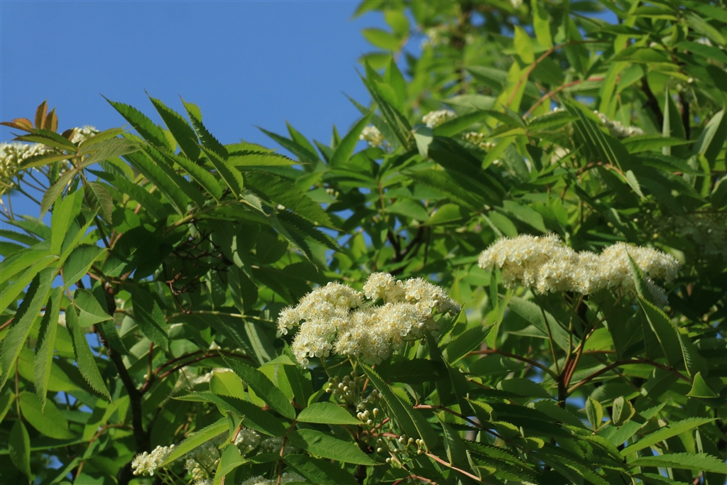 街路樹のナナカマドに花が咲きました。窓ガラス越しの撮影です