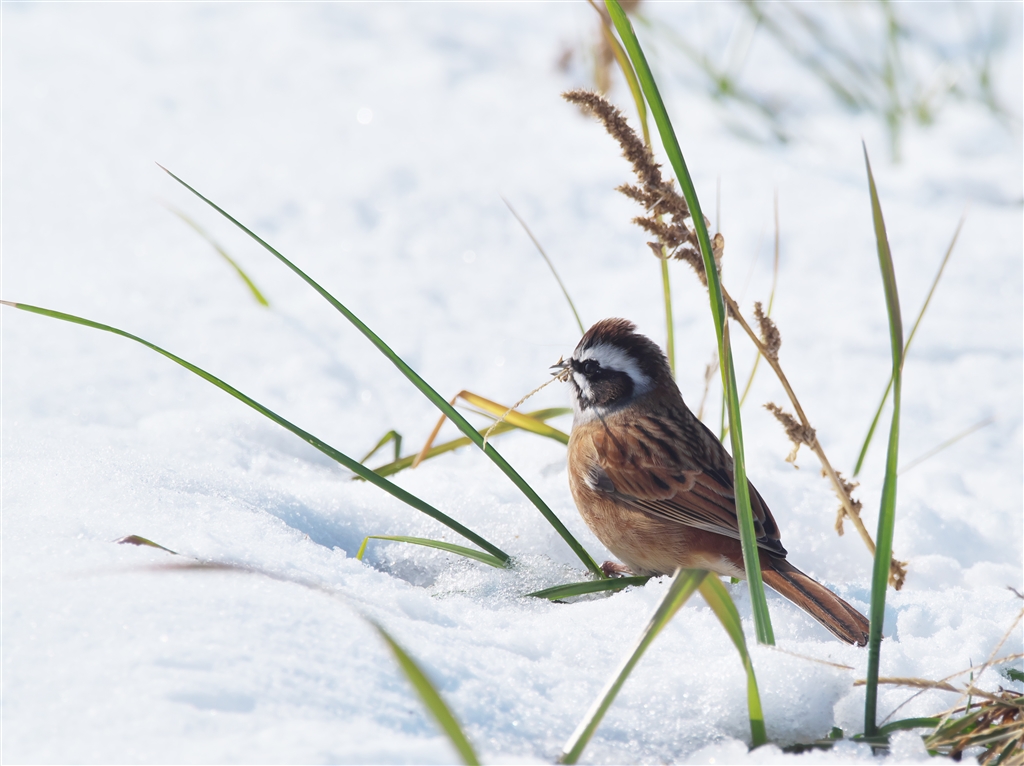こちらも僅かに雪原から覗く枯草に寄るカシラダカ