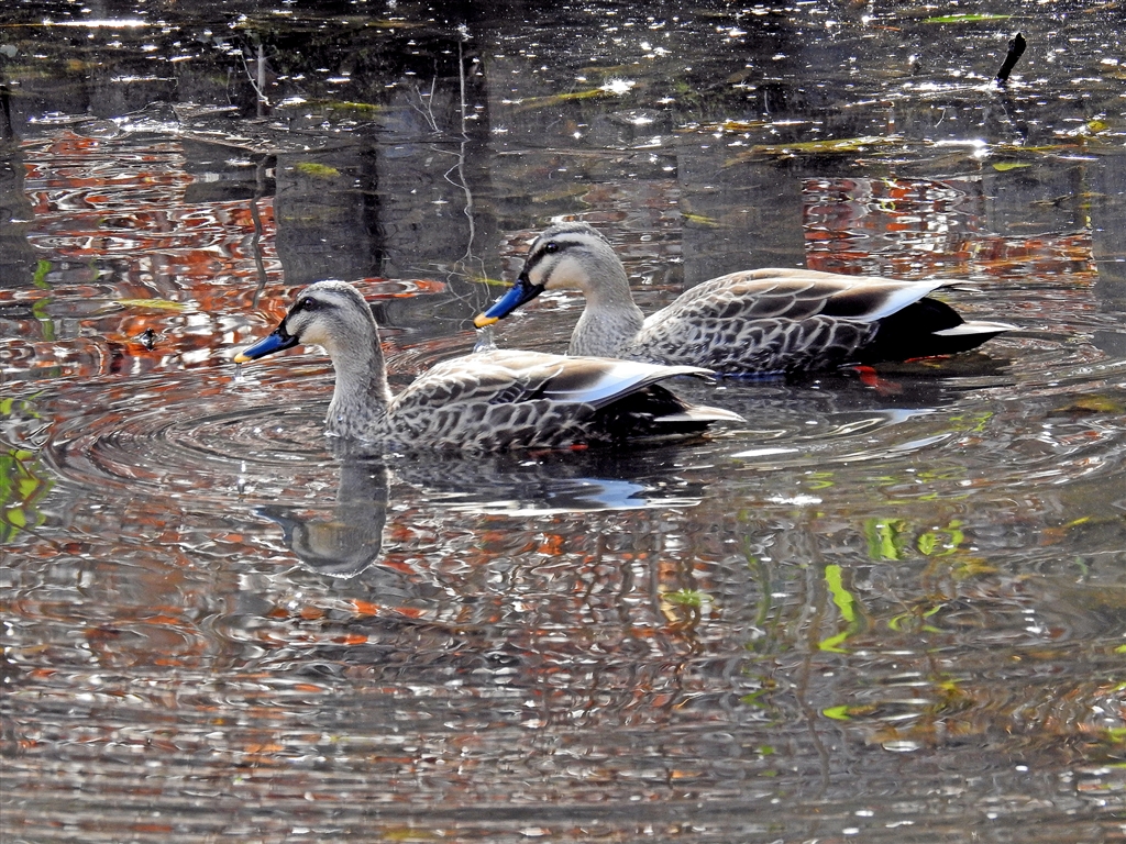 綿毛をつけた蒲の実が舞い落ちる池では、カルガモ夫婦が寄り添っていた。 換算450o