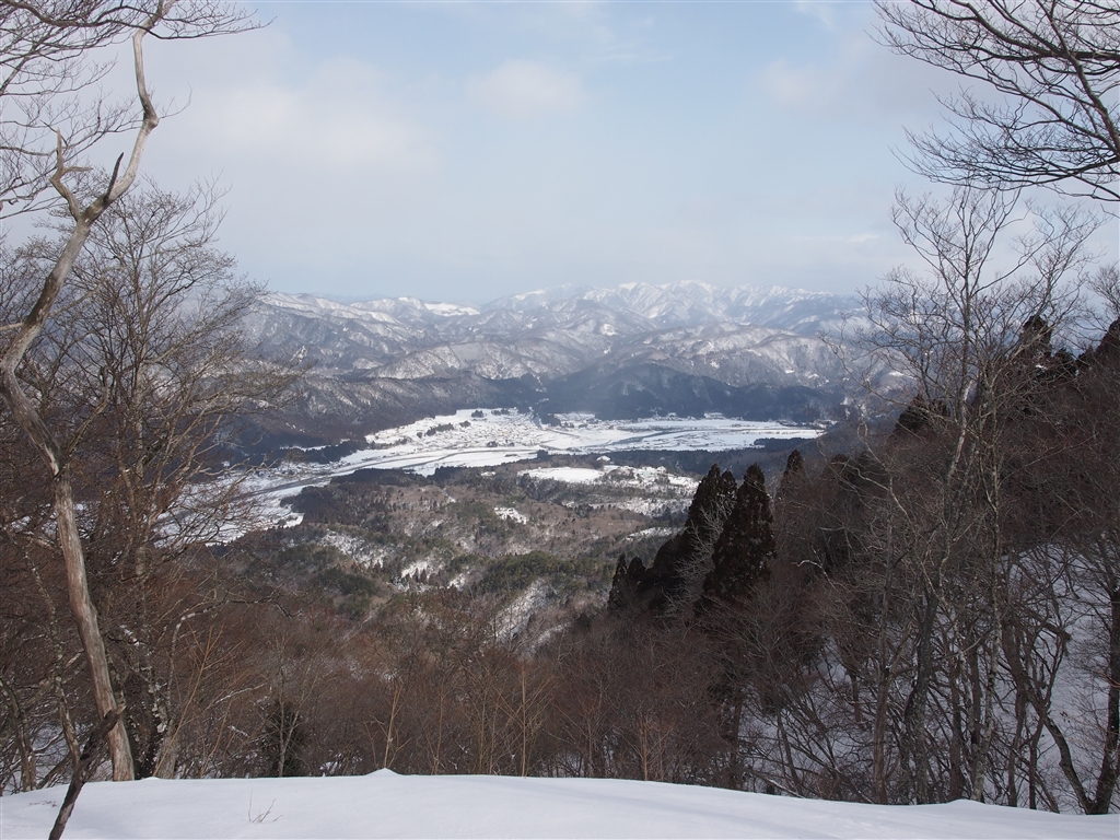 樹林越しに朽木市街と湖西・若狭の山々を望む。