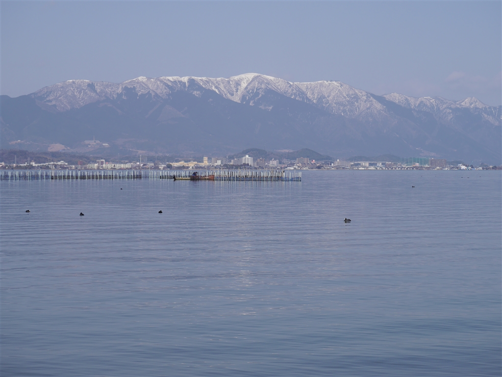 琵琶湖と霞気味な比良の山々。
