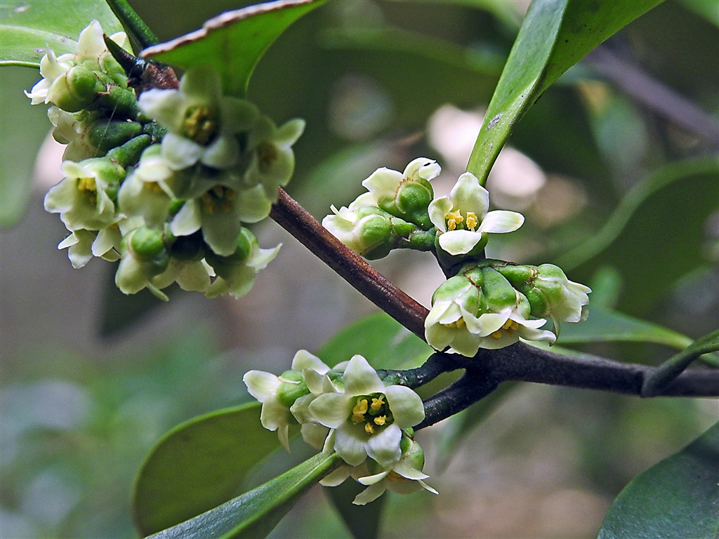 モクレイシ(木茘枝) ニシキギ科の常緑。春先に緑白色の極小花(マクロ3filter使用)
