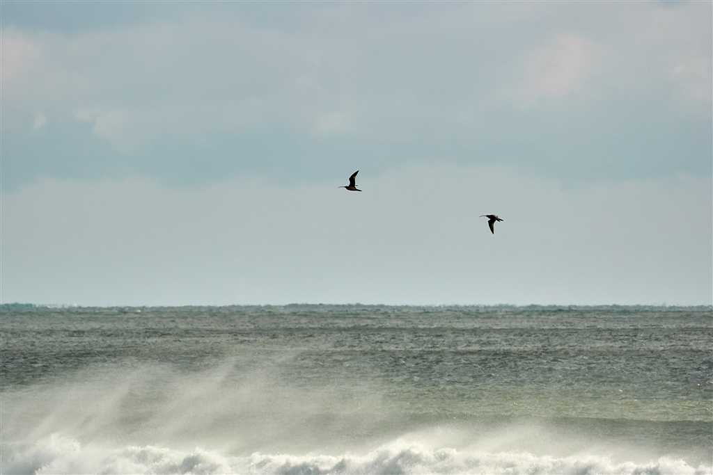 海上では(多分)チョウジャクシギが風をついて飛翔していました