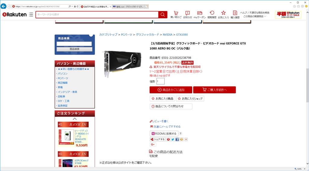 msi GEFORCE GTX 1080 AERO 8G OC(バルク品)