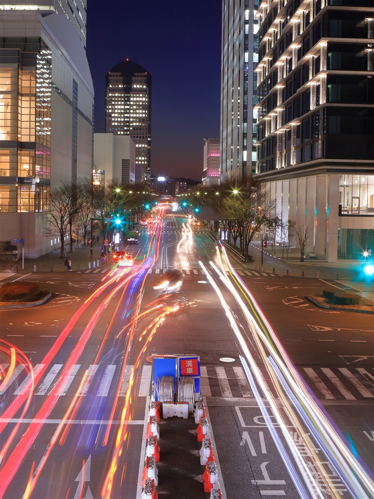 ビルの合間と光の列(横浜・みなとみらい地区にて)
