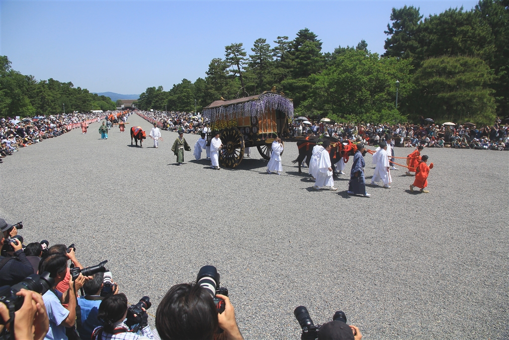 葵祭の撮影現場はこんな感じ(踏み台に載り如意棒でカメラを高く持ち上げて撮影)