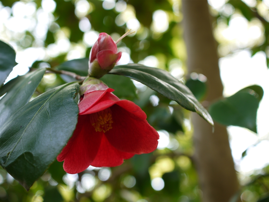 廃れた石段脇に咲くヤブツバキ。