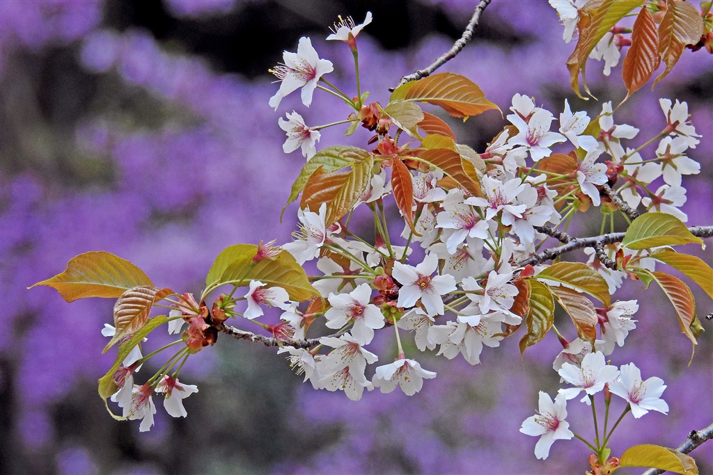 草原に山桜が1本咲き残りコバノミツバとコラボして美しい景観を作っていた