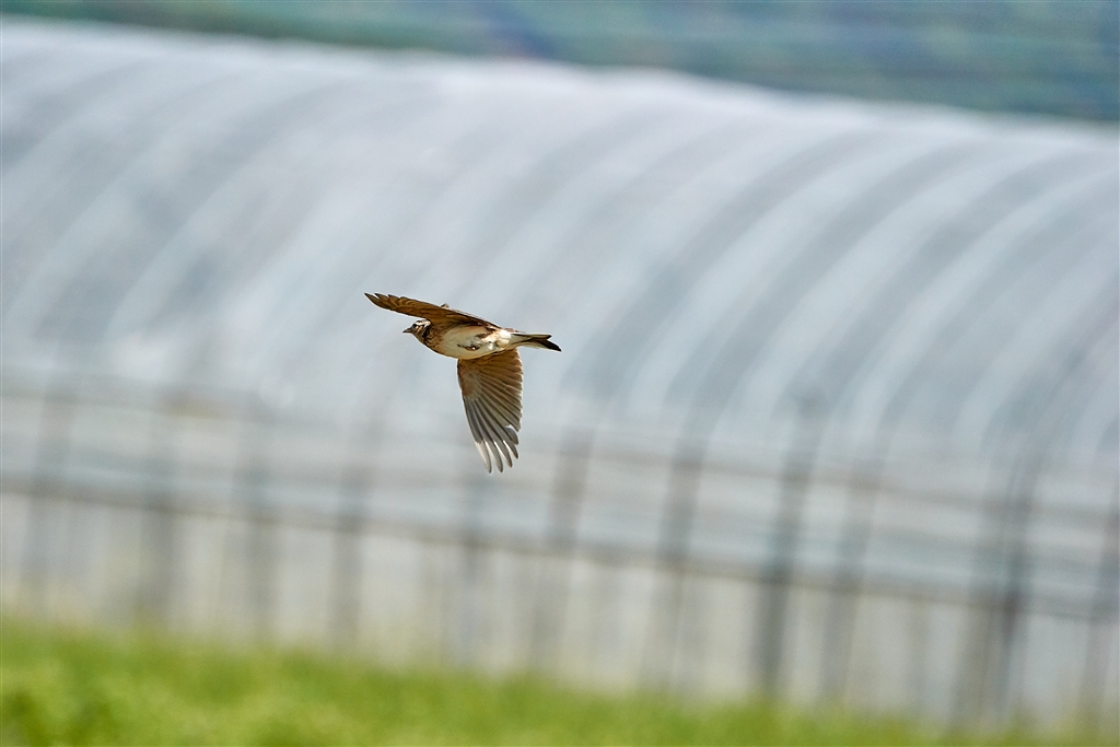 4月の青空の下を鳥が飛ぶ 4 ヒバリ?