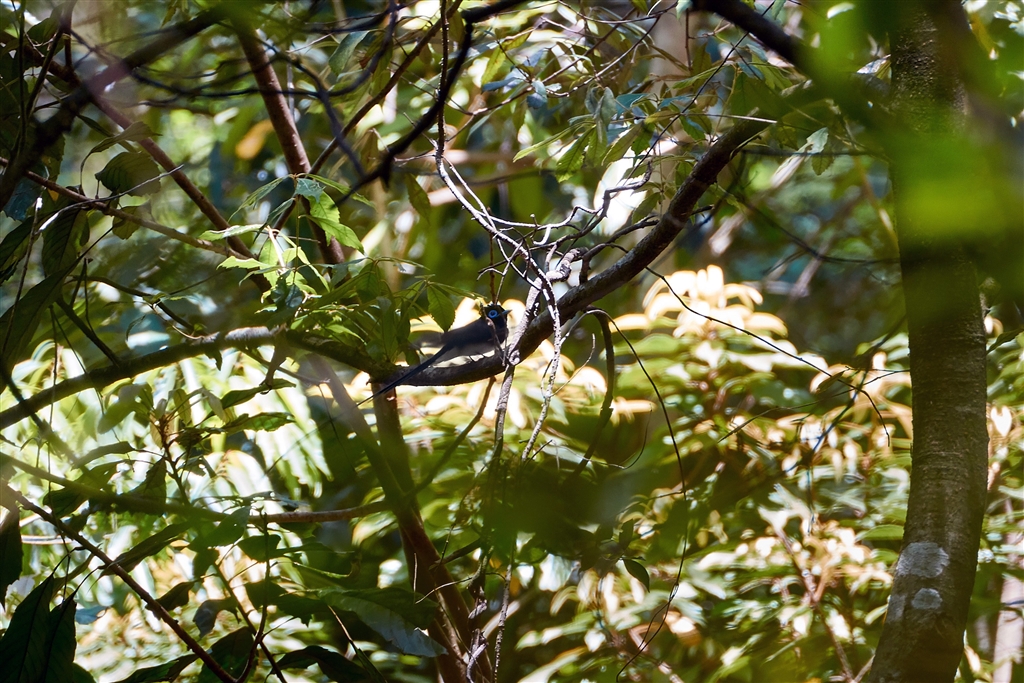 サンコウチョウ♂は遠くに居て近寄ってくれず。枝も邪魔。ワンショットのみ