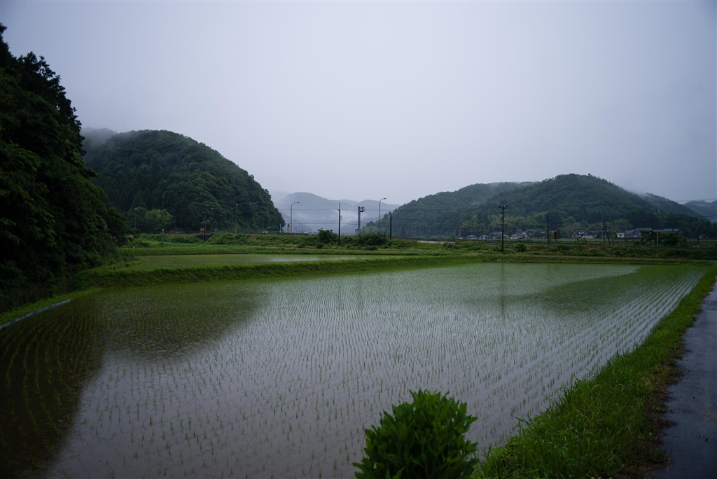 雨空と水田。