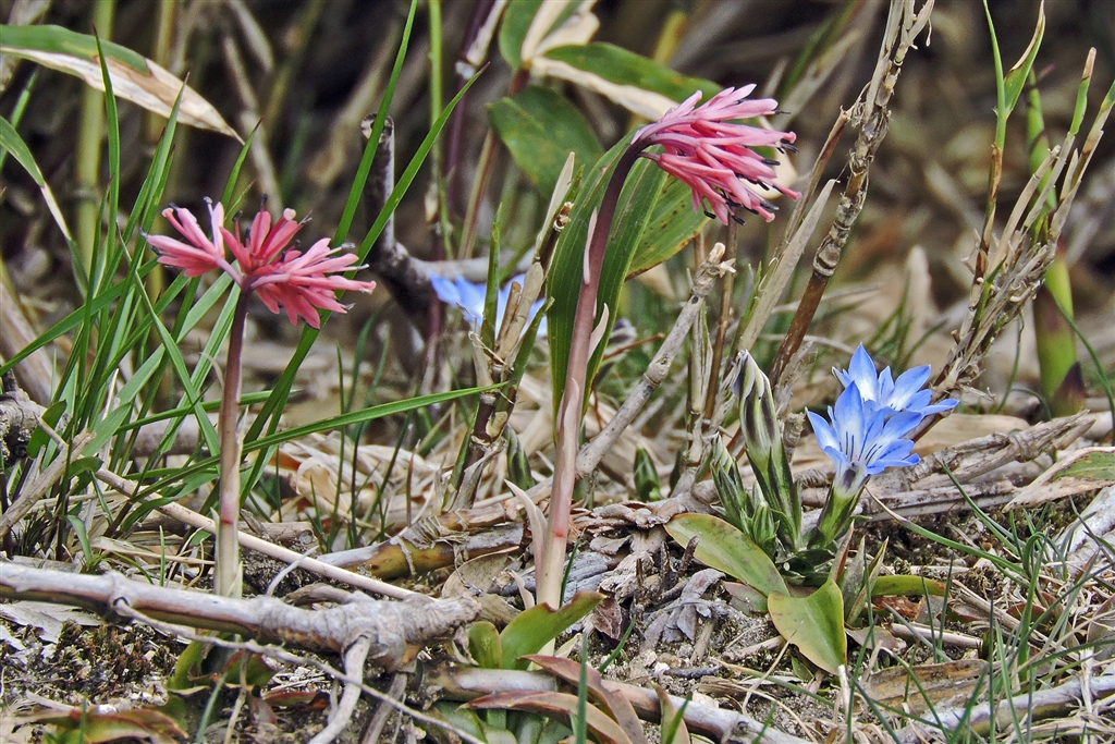 赤のショウジョウバカマと青のハルリンドウがコラボしていた〈御在所岳〉