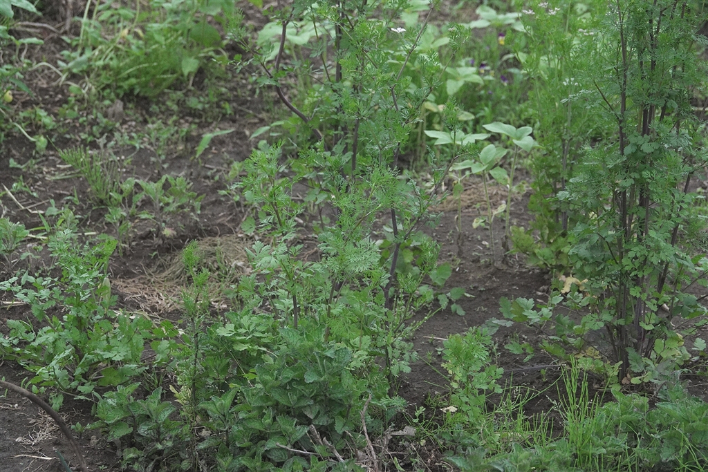 裏の畑の植物の静かな戦い パクチーvsミントvsスギナなど