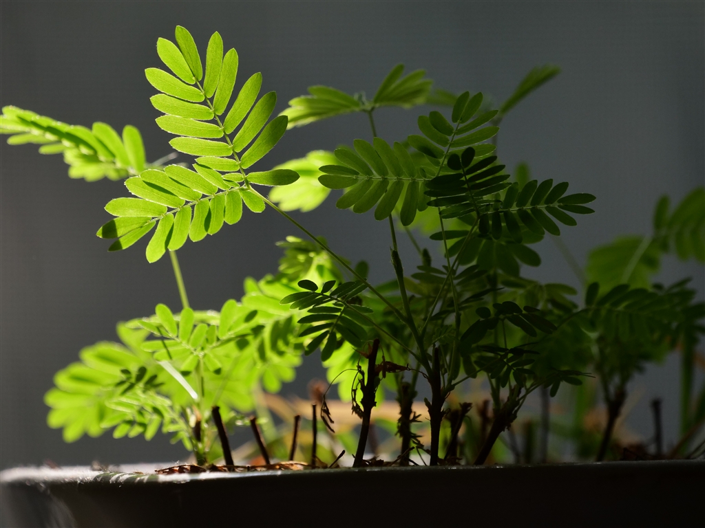 不思議な草,オジギ草 夜は葉を閉じて寝ます.又昼間も触ると葉を閉じます