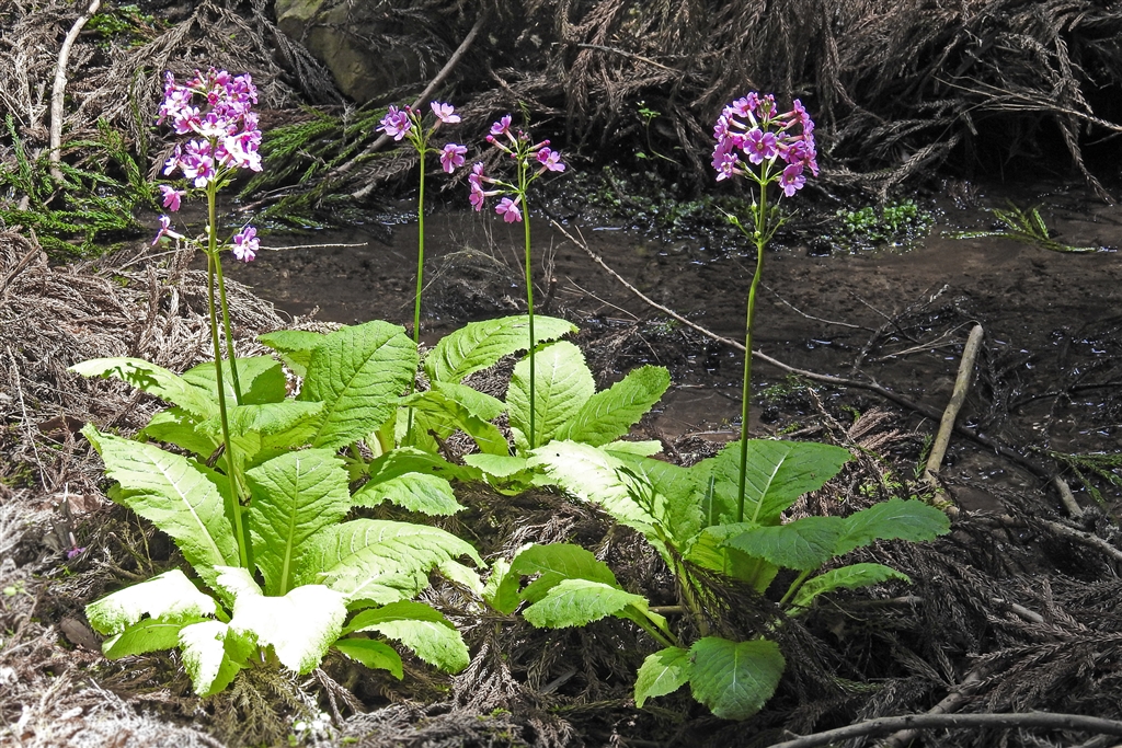 →花弁が深く5裂し輪状に咲き、葉は楕円形で皺が多く葉柄が長い。ブリムラ類は西洋桜草