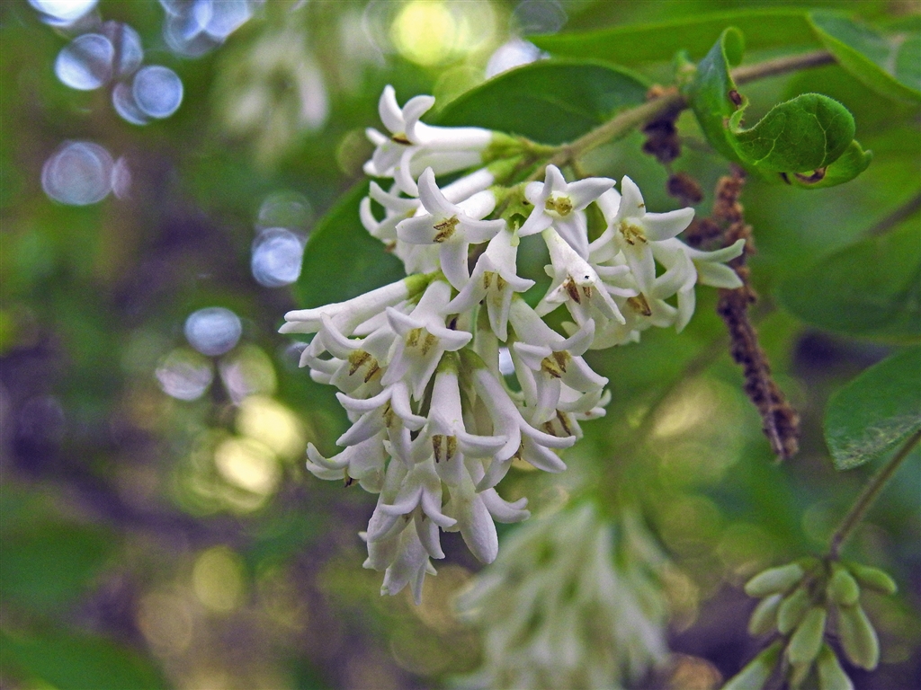 →花序に付く花は白色。長さ7〜9oの筒状漏斗形で先は4裂する