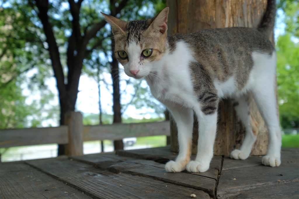 東屋で写真の確認をしていたら、テーブル?に上がってきました