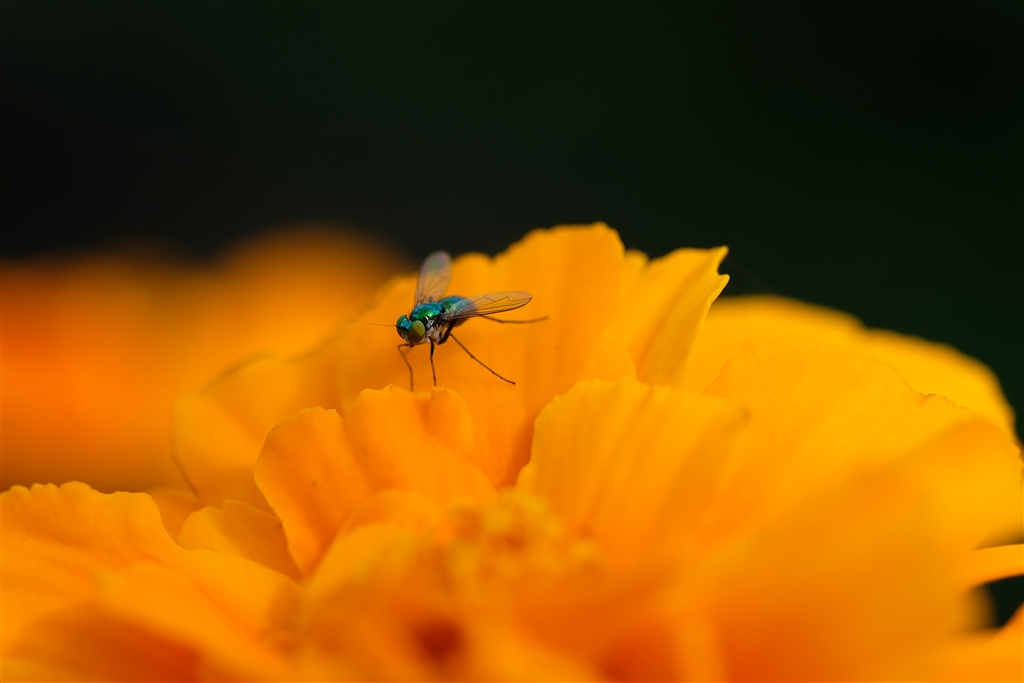 マリーゴールドにとまった虻です X-T2にEF100Rマクロ(Fringer)