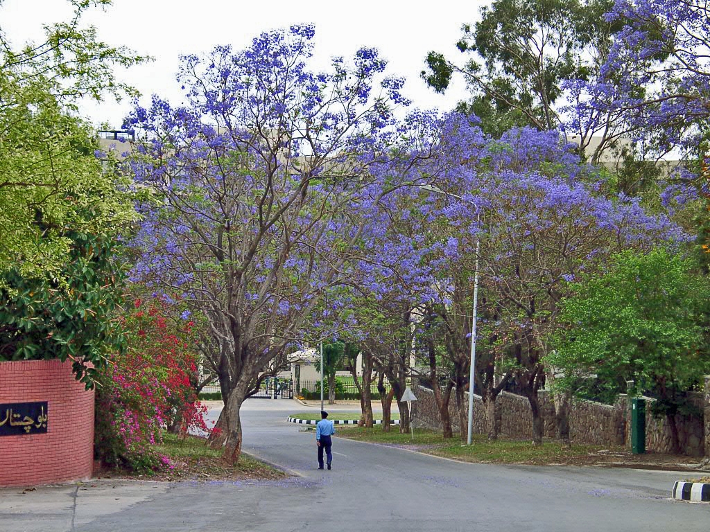 パキスタン陸軍司令本部前のジャカランダ並木。赤いのはブラシの木の花だったかな