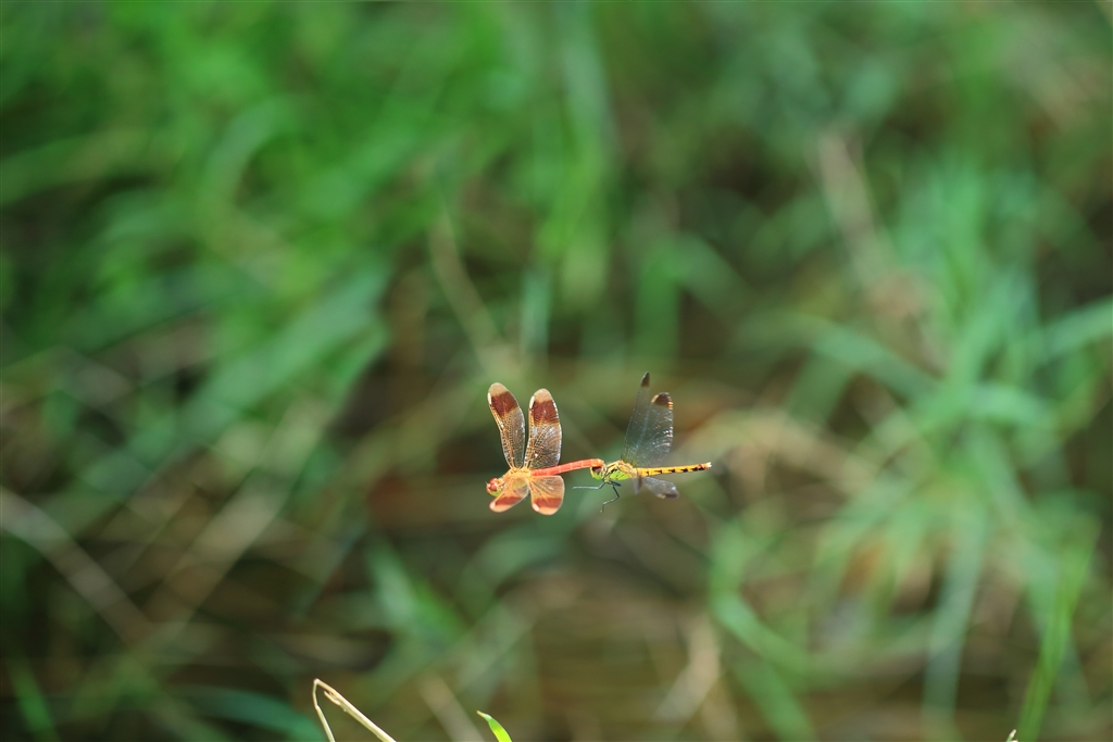 ミヤマアカネの♂(前)がマユタテアカネの♀(後)を強引に婚活