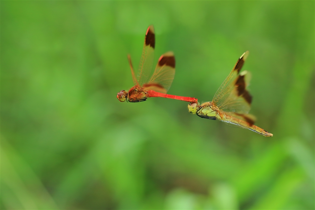 曇り空の下でタンデム飛行するミヤマアカネ