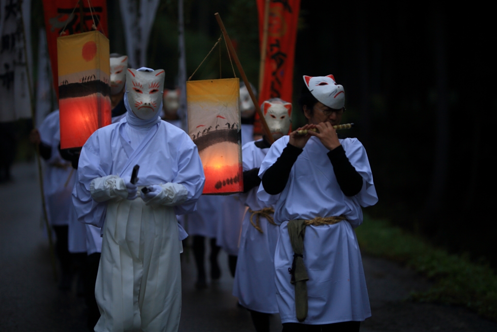 拍子木と笛で列を誘導する