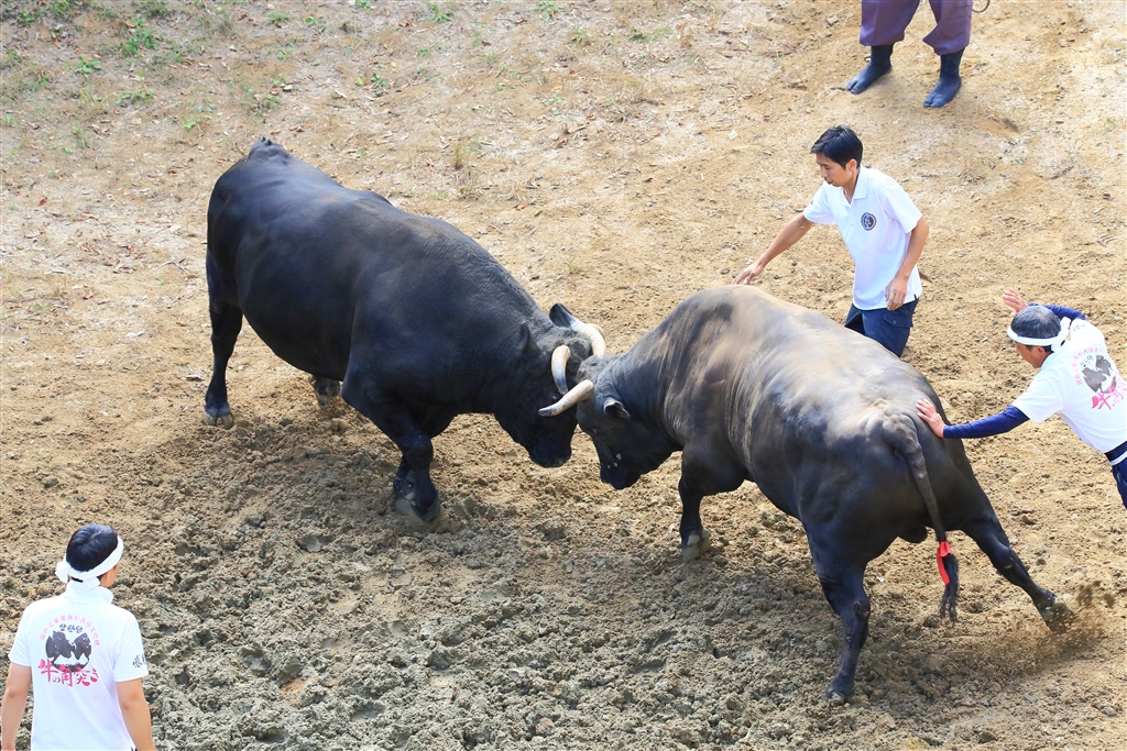 勢子が牛の尻を叩いてハッパをかけ闘争心を盛り立てる