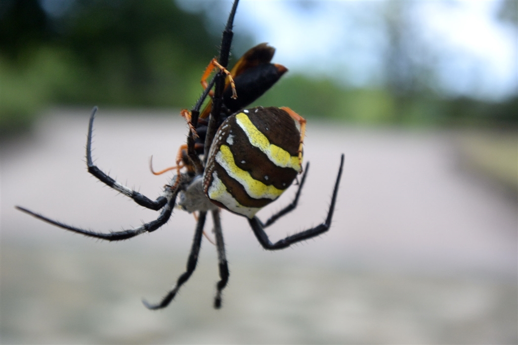 蜘蛛と蜂の格闘中 蜂有利な模様 ピンボケギミ