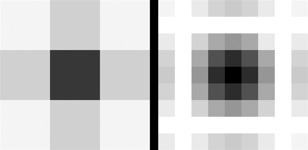 (左)センサー1の「3画素×3画素」、(右)センサー2の「9画素×9画素」