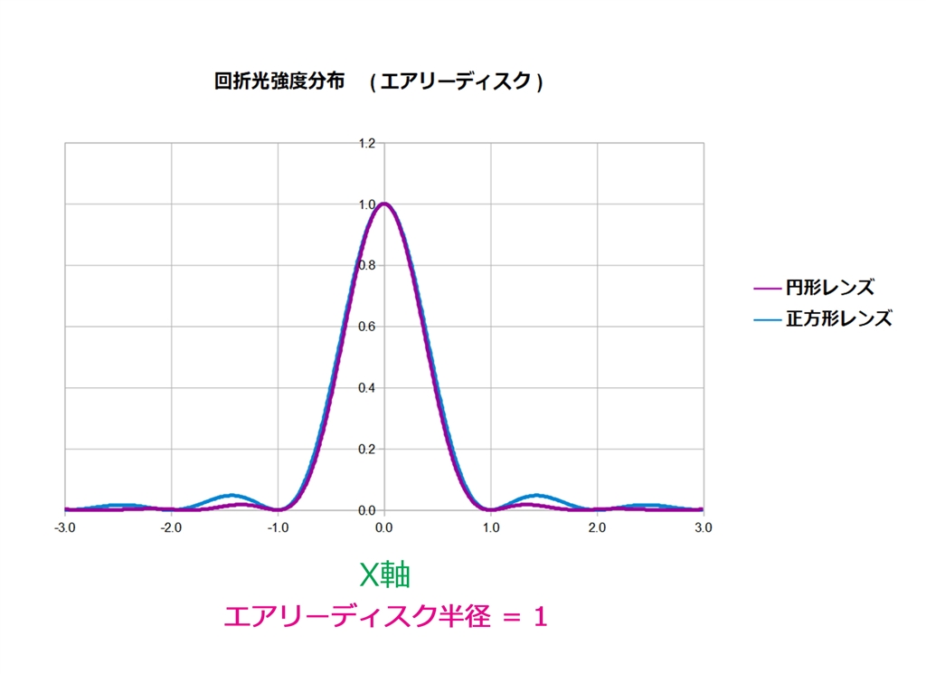 『正方形レンズ及び円形レンズのエアリー強度分布 (X軸)』 デジタル一眼カメラすべて ミスター・スコップさんのクチコミ掲示板画像3/4
