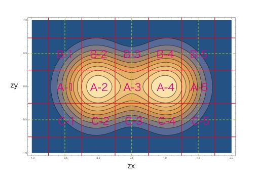 強度分布を(zx,zy)平面で等高線表示し、画素ピッチを示したもの。
