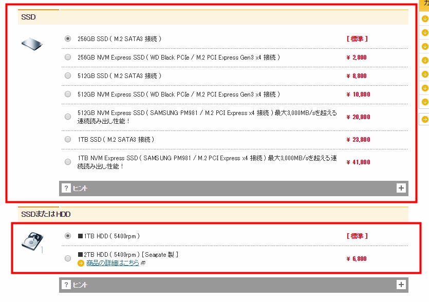 SSDの容量とHDDの容量を選択できます。