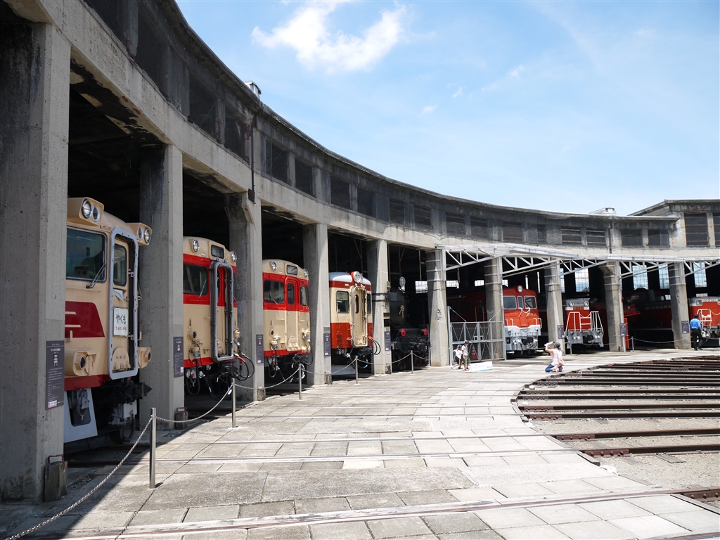 旧津山扇形機関車庫には引退したディーゼルカーが主体となり並ぶ。