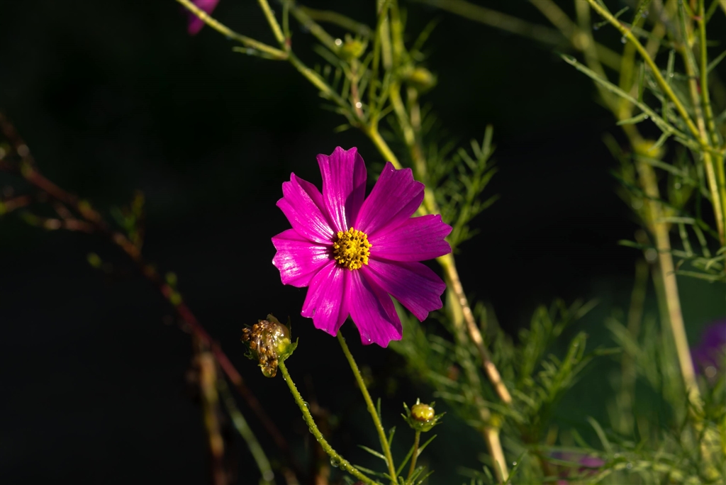 朝日を浴びたコスモス。