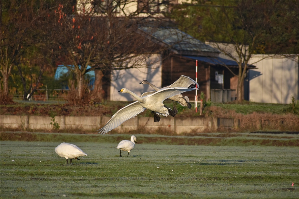 餌場へ降りる白鳥
