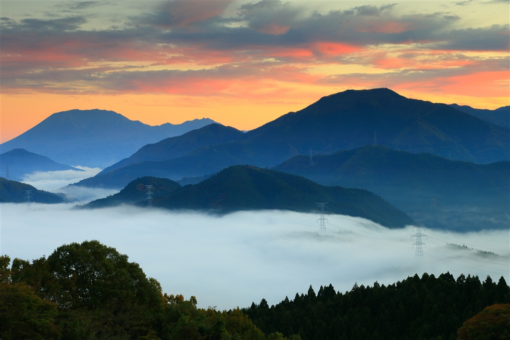 日出の約6分前(空はオレンジ色に染まり濃紺の山々と白い雲海の色彩が綺麗)