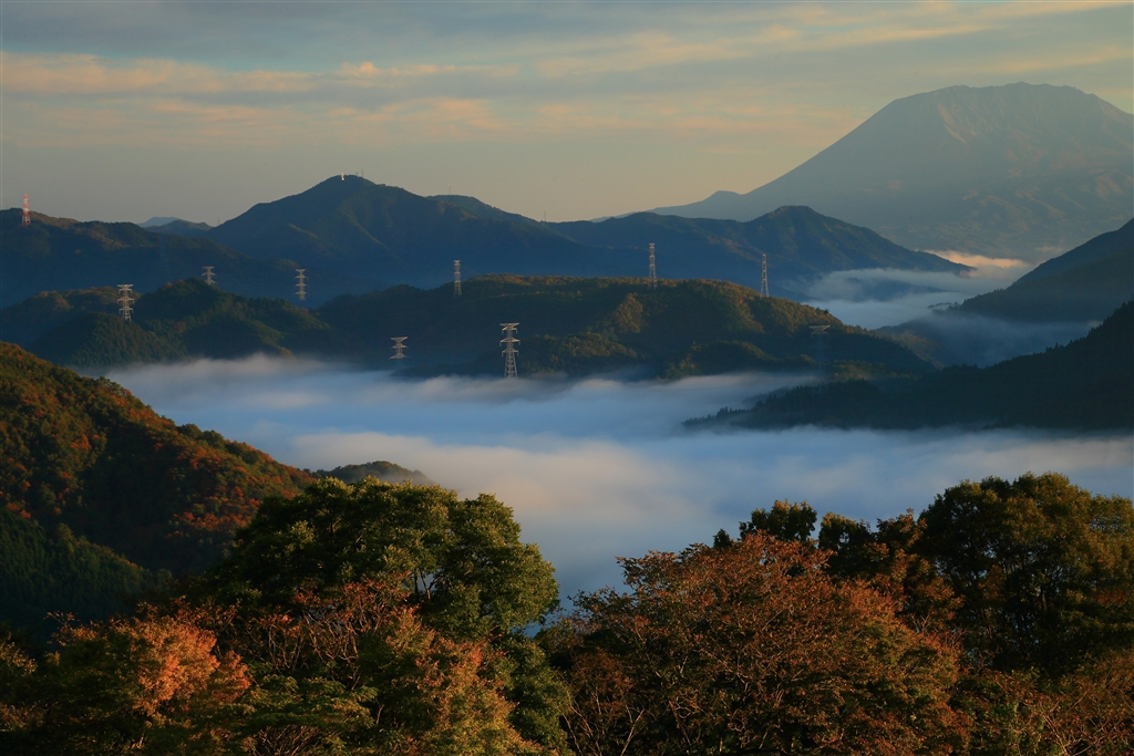 日出から約30分過ぎ(朝日が射して紅葉も雲海も赤く染まる)