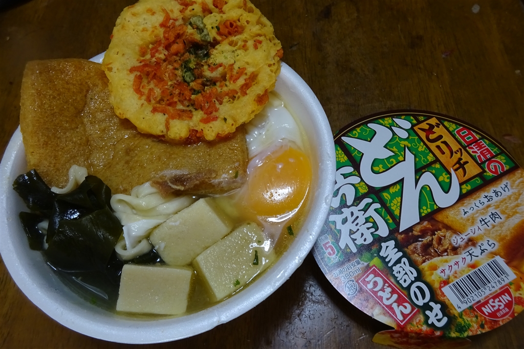 厚いお揚げにサクサク天婦羅と牛肉入り! さらに卵と高野豆腐、ワカメも加えました!