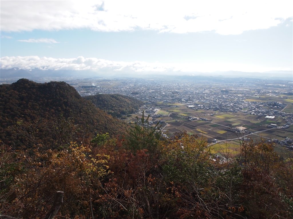 小脇山より太郎坊山と麓の市街を望む、遠くには雲が掛かった鈴鹿山系が見えます。