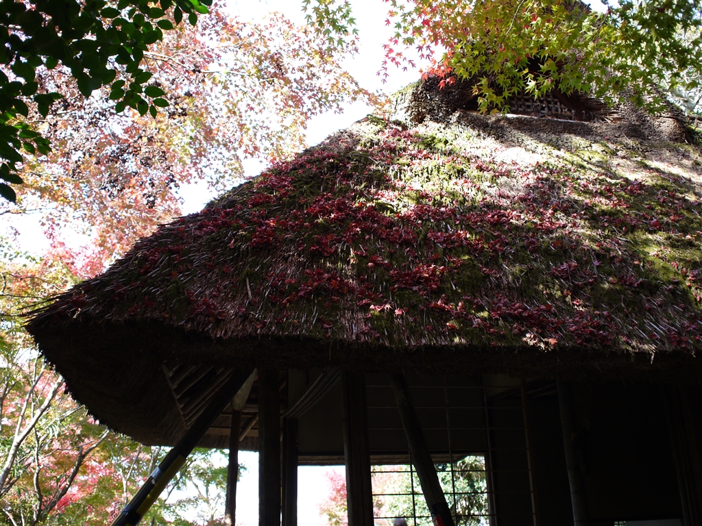 藁ぶき屋根の芭蕉庵…老朽化で支柱有り。