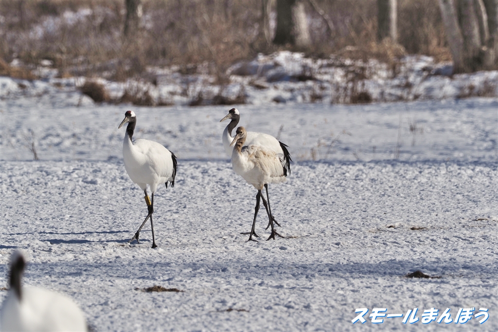 タンチョウの親子(頭が茶色い子が昨年生まれ)