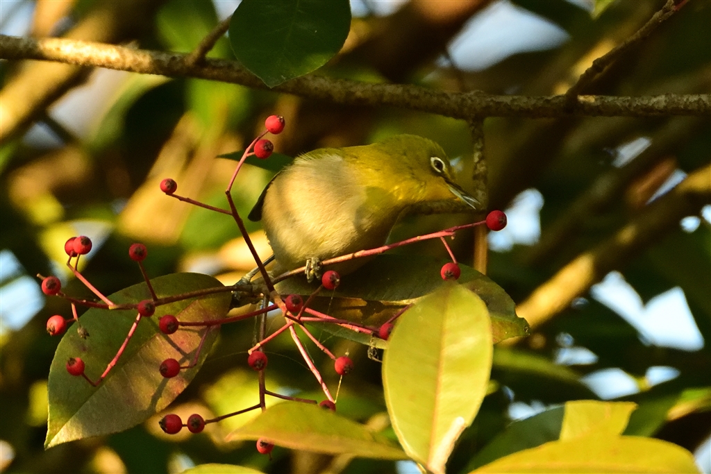 12月31日 赤い実に口寄せするメジロ