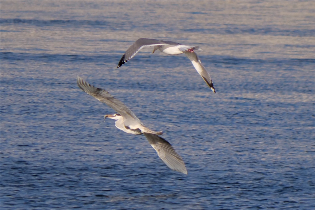 アオサギの魚を狙うセグロカモメ
