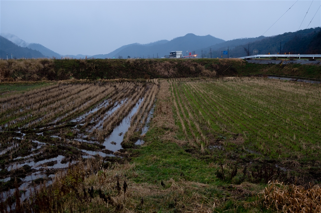 小雨の水田と県境の山