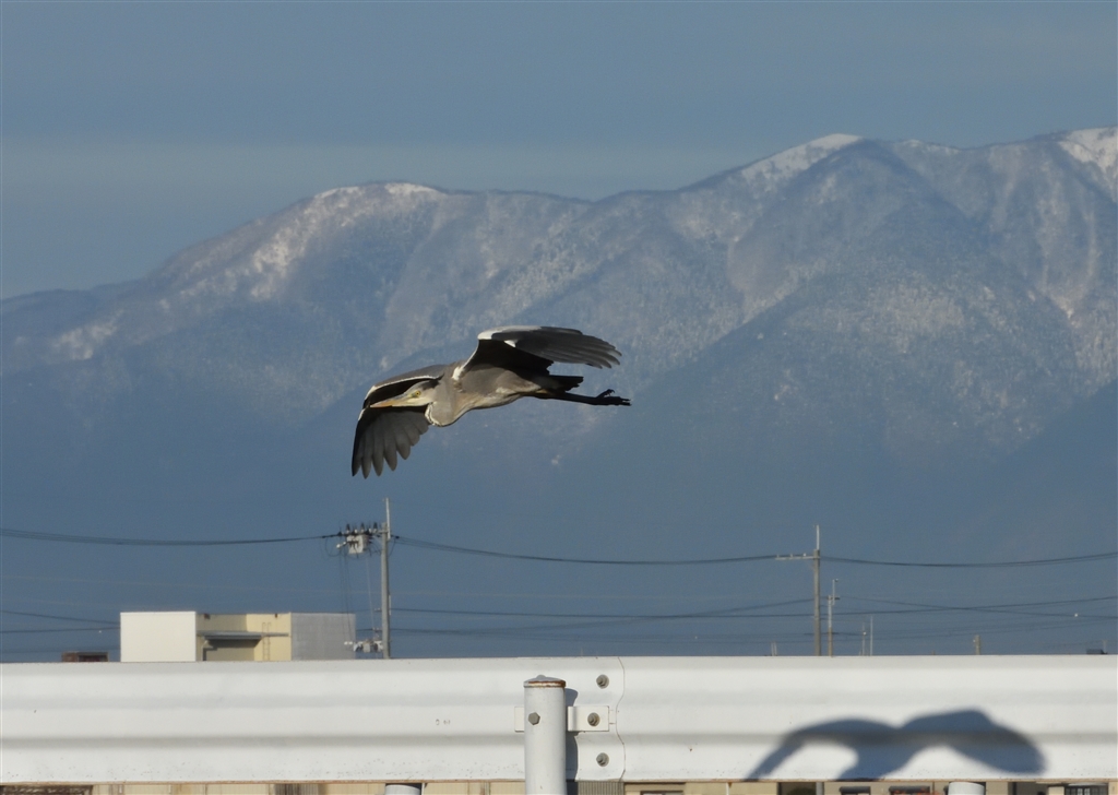 積雪の比良山系をバックに アオサギの飛翔
