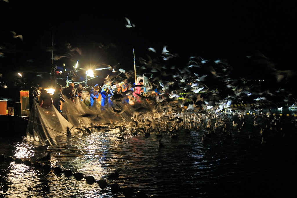上ってきたホタルイカを狙って猛烈な数のカモメが集まってくる