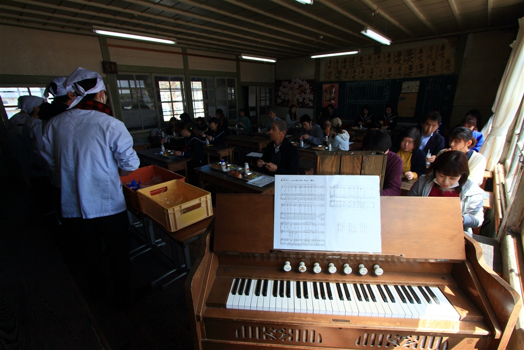 給食後はオルガンの演奏に合わせて唱歌(ふるさと)をみんなで歌う