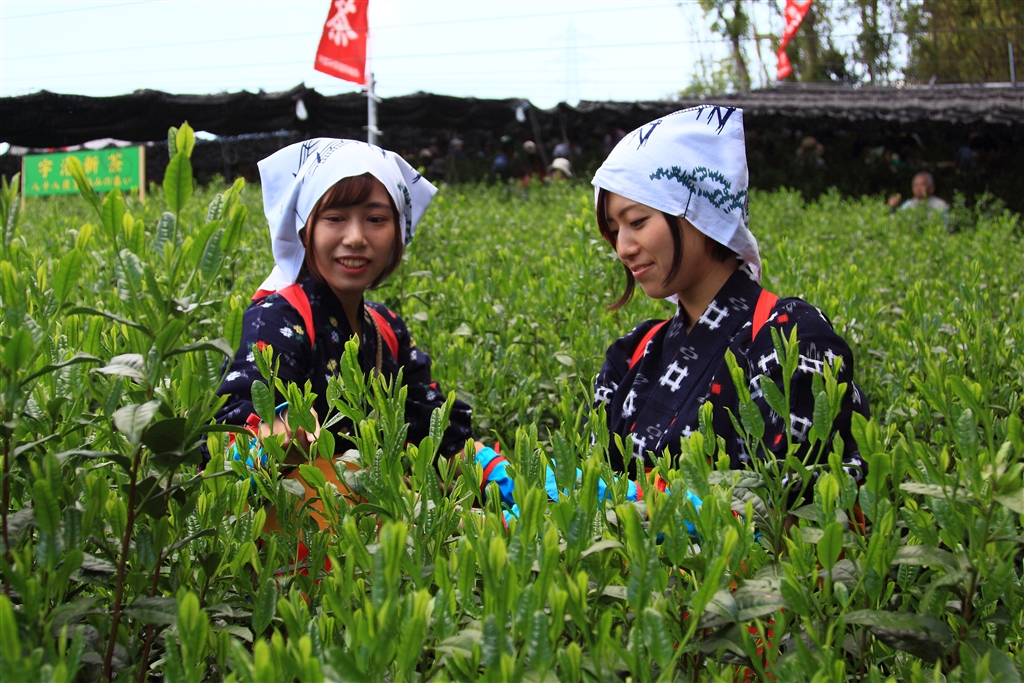宇治で茶娘が茶摘みをする