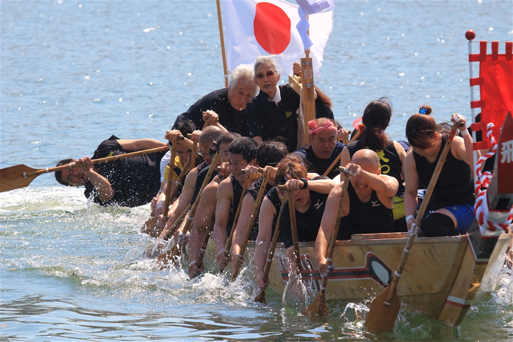 後ろで倒れかかっている漕ぎ手はUターンする艇のバランスをとっている