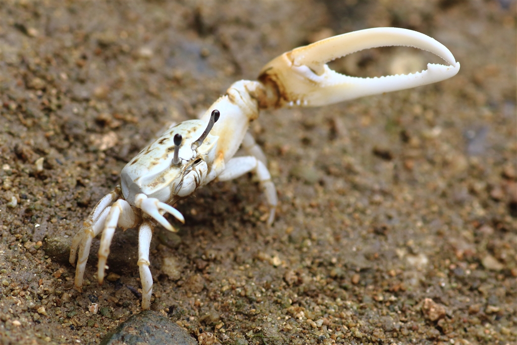 シオマネキのオスは右か左のハサミが異常に大きく「こっちへ来い」と振ってメスを誘う